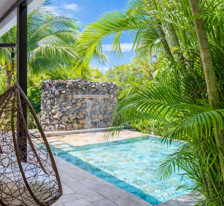 Delightful bedrooms that allow sunlight and fresh air to enter, creating a serene and welcoming atmosphere. The beautiful blue pool glistens under the warm sun, inviting you for a refreshing swim, while the lush greenery surrounding the area adds a vibrant touch to the overall aesthetic. Each morning can feel like a vacation, as you wake up to the gentle sounds of nature and the comforting sight of a picturesque landscape right outside your window. It's truly a nice way to start your day, surrounded by beauty and tranquility.