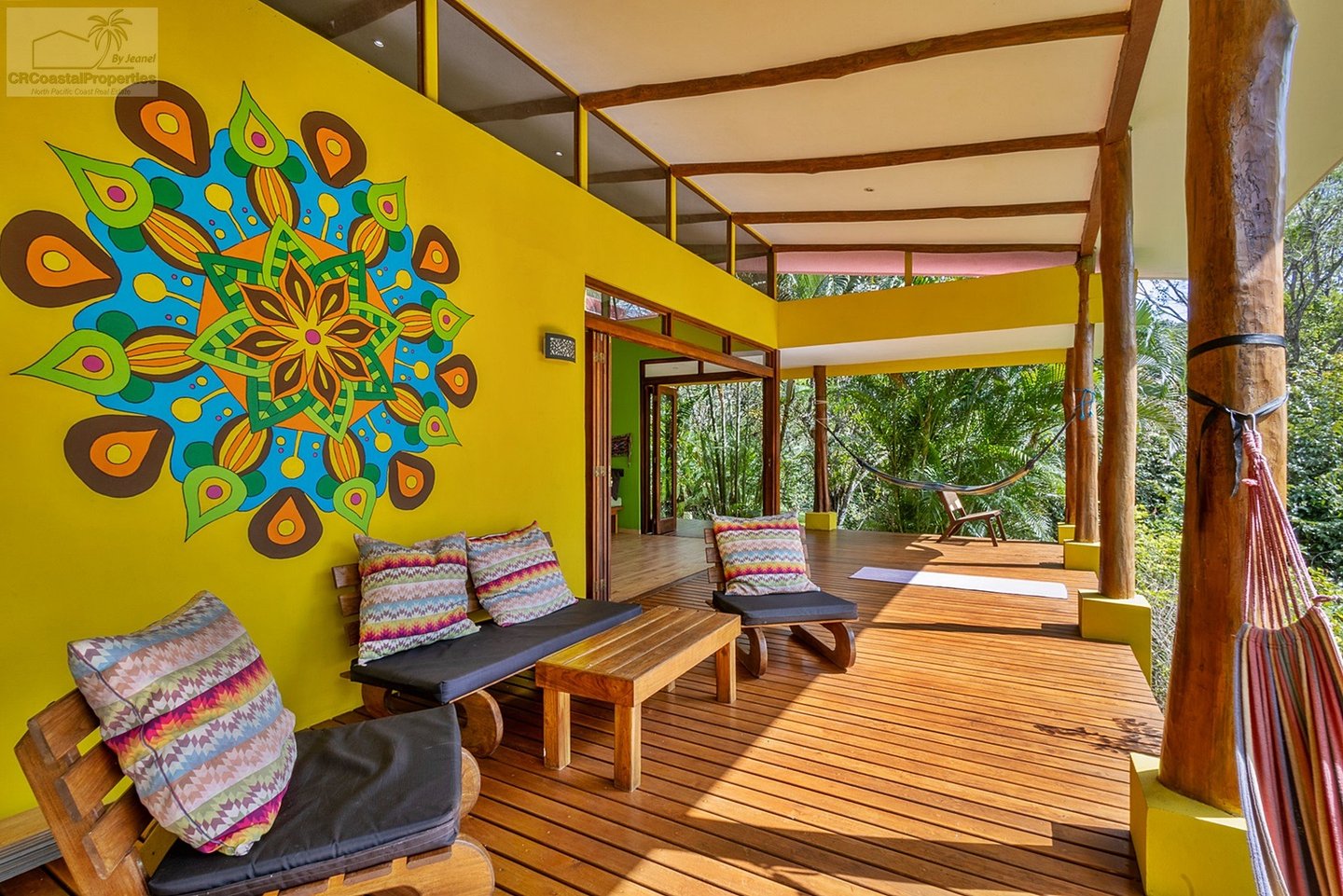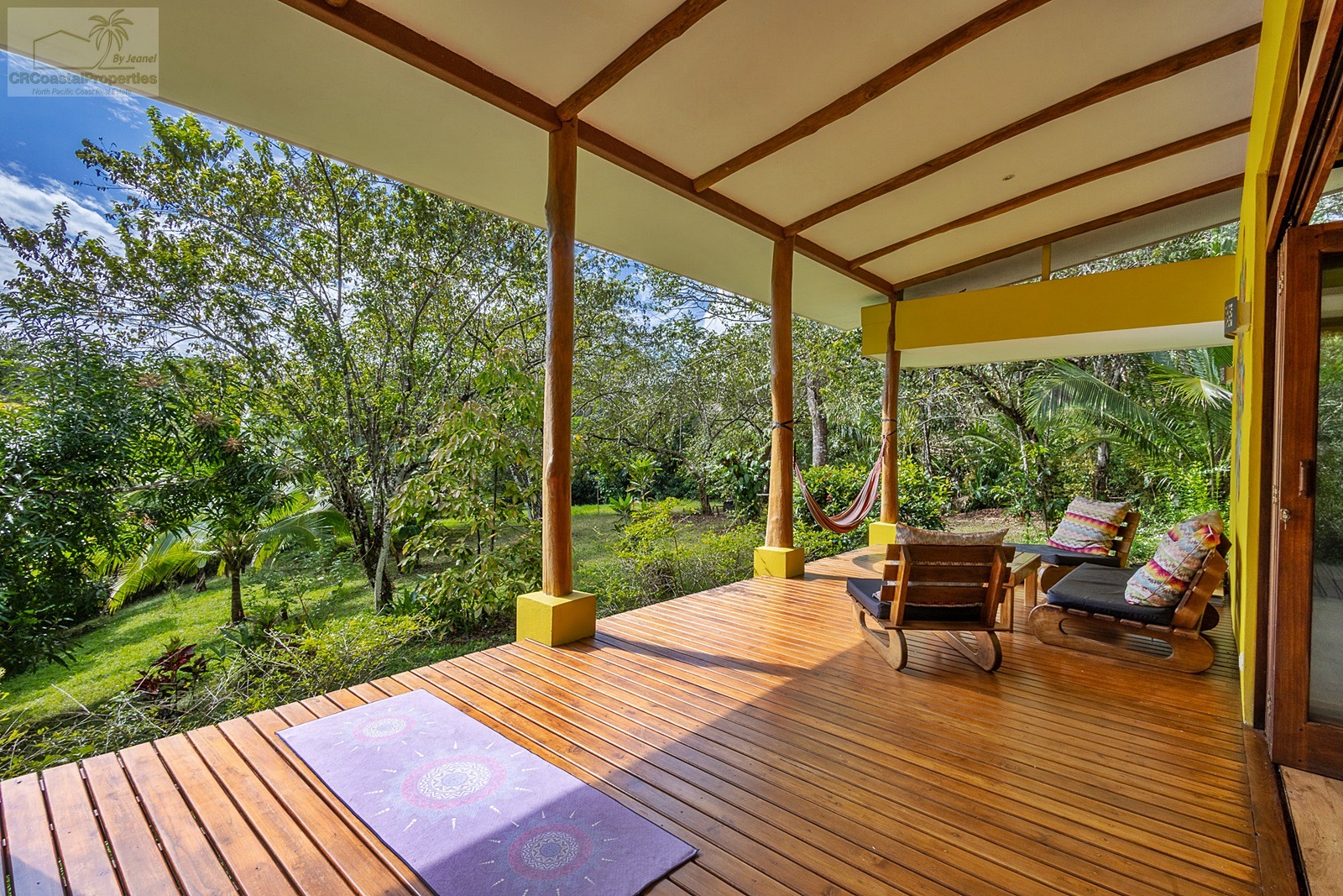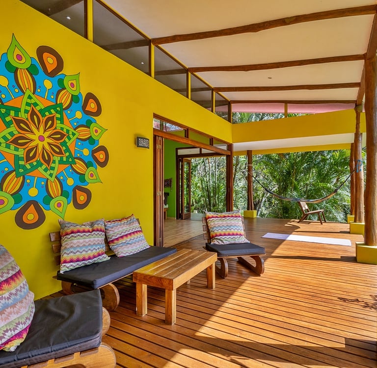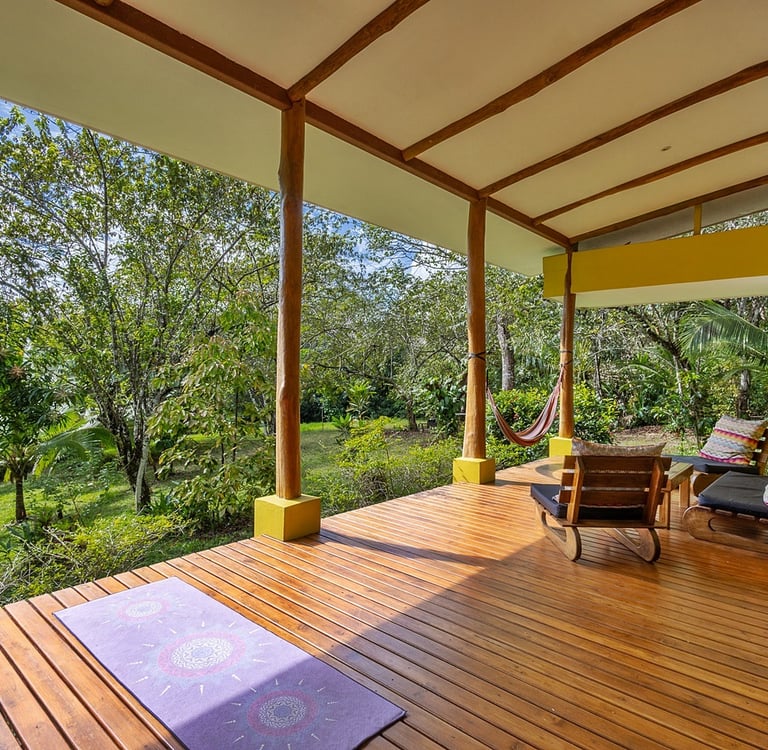 The spacious deck area is adorned with comfortable and inviting seating arrangements. It serves as an ideal spot to breathe in the fresh, invigorating air and take in the stunning, picturesque views of the surrounding landscape, which changes beautifully with the seasons. The deck could be utilized not only for yoga retreats or meditation sessions but also as the prime area where most time is spent watching the vibrant wildlife or enjoying family gatherings under the open sky. The deck is crafted from Teca, which is known for being a high-quality hardwood that thrives in this region, ensuring durability and a timeless aesthetic appeal. This harmonious blend of thoughtful architecture and the utilization of nature's exquisite wood features and elements within the home creates a tranquil retreat. It is a place where moments of joy are shared, friendships are strengthened, and memories are made against the tranquil backdrop of the great outdoors.