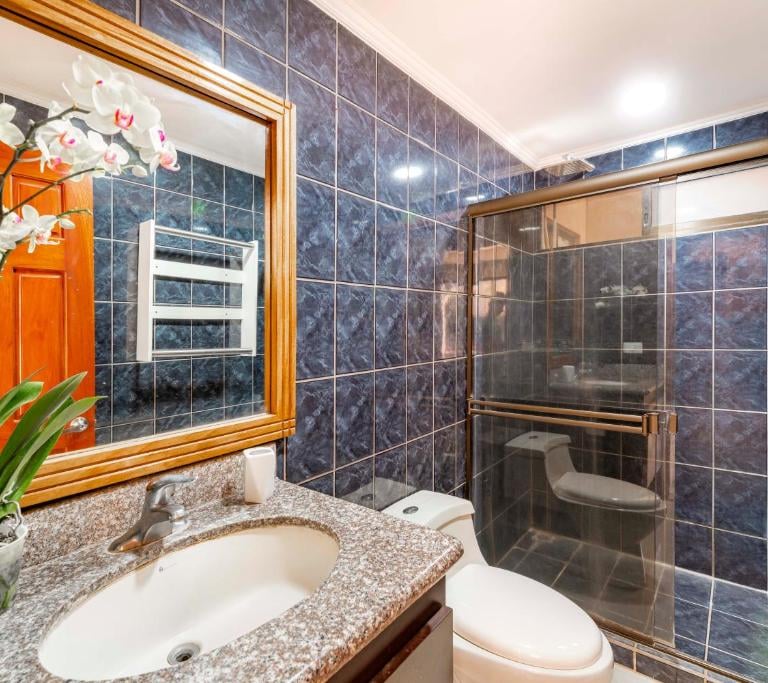 Enchanting bathroom with a modern shower and a stylish toilet, featuring sleek fixtures and soft ambient lighting that creates a calming atmosphere. The spacious layout allows for easy movement, while decorative tiles and lush plants enhance the overall aesthetic, making it a perfect retreat for relaxation and rejuvenation.